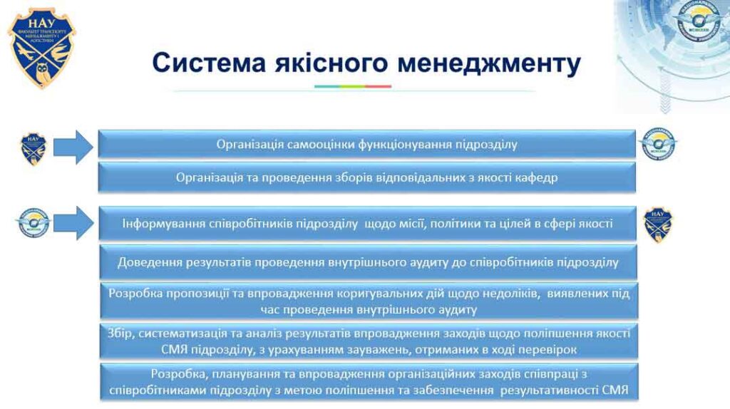 На факультеті транспорту, менеджменту і логістики заплановані наступні організаційні заходи щодо системи менеджменту якості: